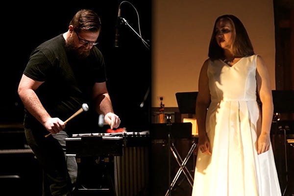 This singer and percussion duo will perform rarely heard pieces by Lou Harrison and Morton Feldman. They will play Lou Harrison's May Rain (1941) and Morton Feldman's Follow thy faire sunne". Their performance is part of the New Music/Research concerts, and is the first concert on Thursday.