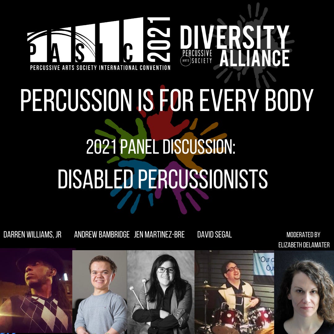 The PAS Diversity Alliance will be hosting a discussion with disabled percussionists Friday, November 12th at 1:00pm in Room 204 of the Convention Center. The panel will be moderated by Elizabeth Delamater and features panelists: Jen Martinez-Bre, Darren Williams Jr, Andrew Bambridge, and David Segal. They will be speaking on their experiences as disabled percussionists and how to create a more accessible field.
